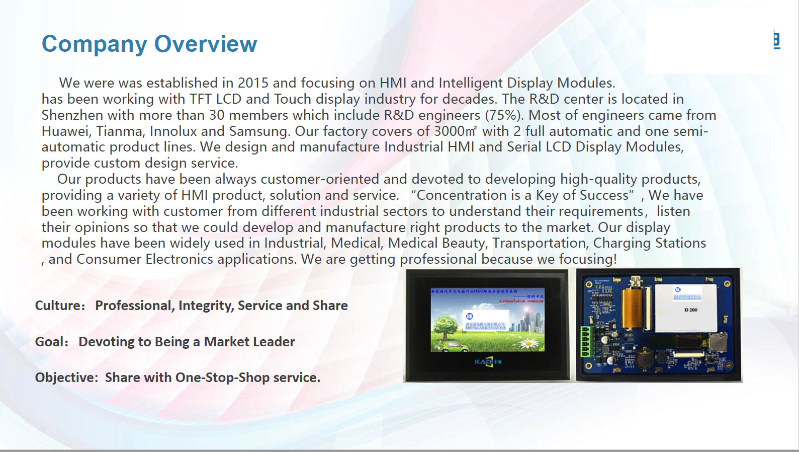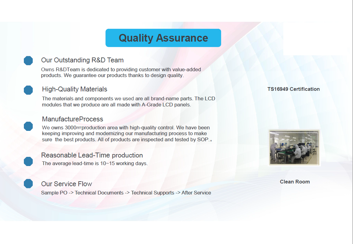 Notre usine s'étend sur 3000m² avec 3 lignes de production dont 2 entièrement automatiques et une autre qui est semi-automatique. Nous concevons et fabriquons des modules industriels d'IHM et d'affichage LCD en série, et nous fournissons un service de conception sur-mesure.